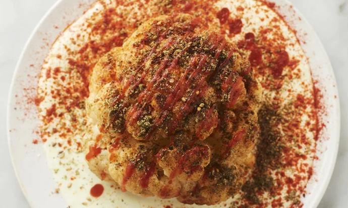 Leg de bloemkool op de yoghurt met tahin en bestrooi met het gerookte-paprikapoeder, het sesamzaad, de blaadjes tijm, peper uit de molen en fleur de sel. Werk af met wat pikante saus.